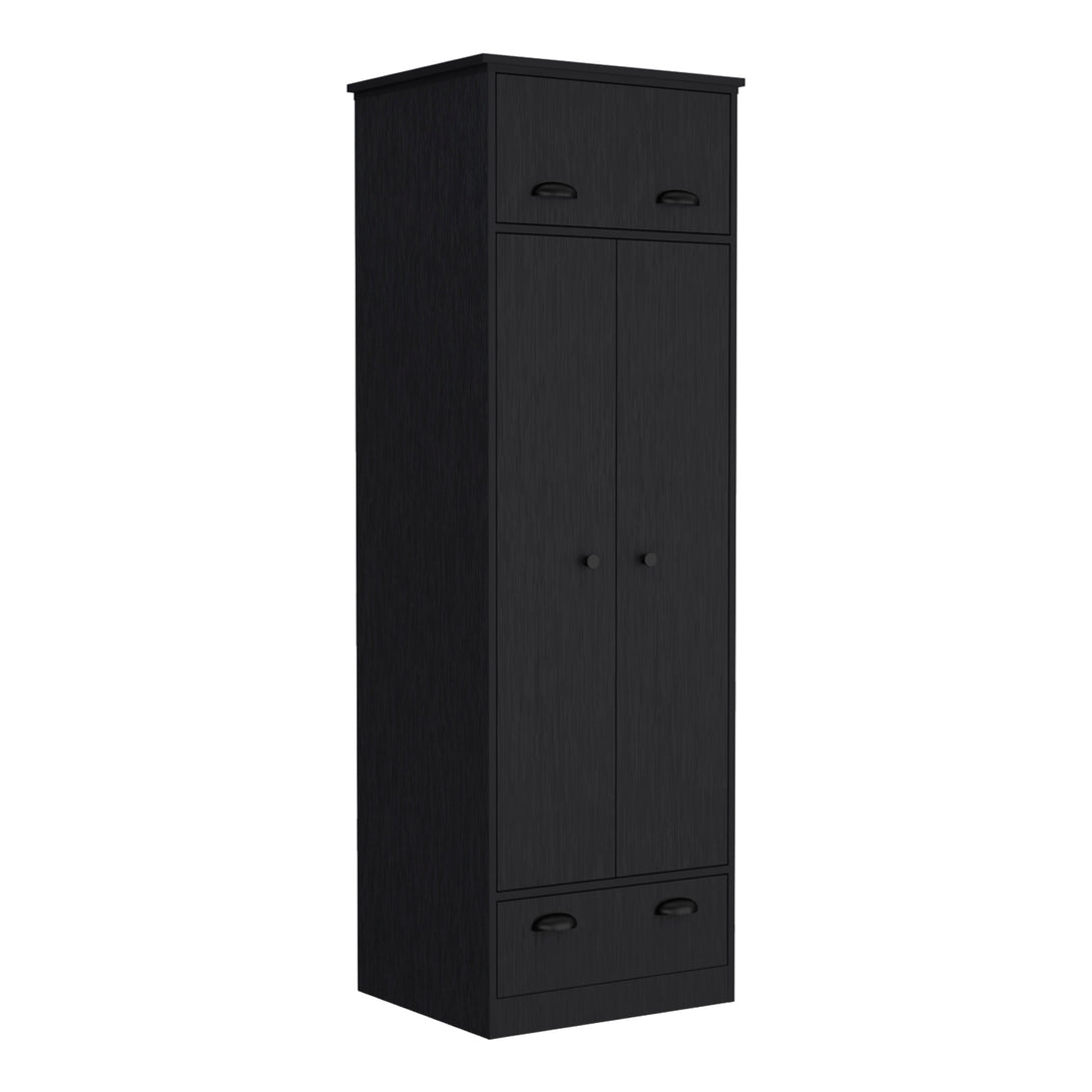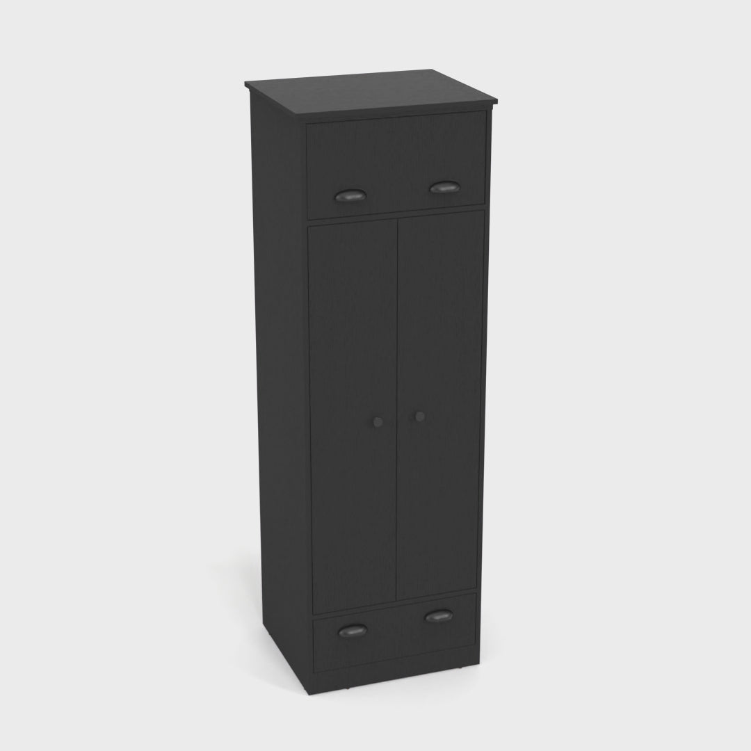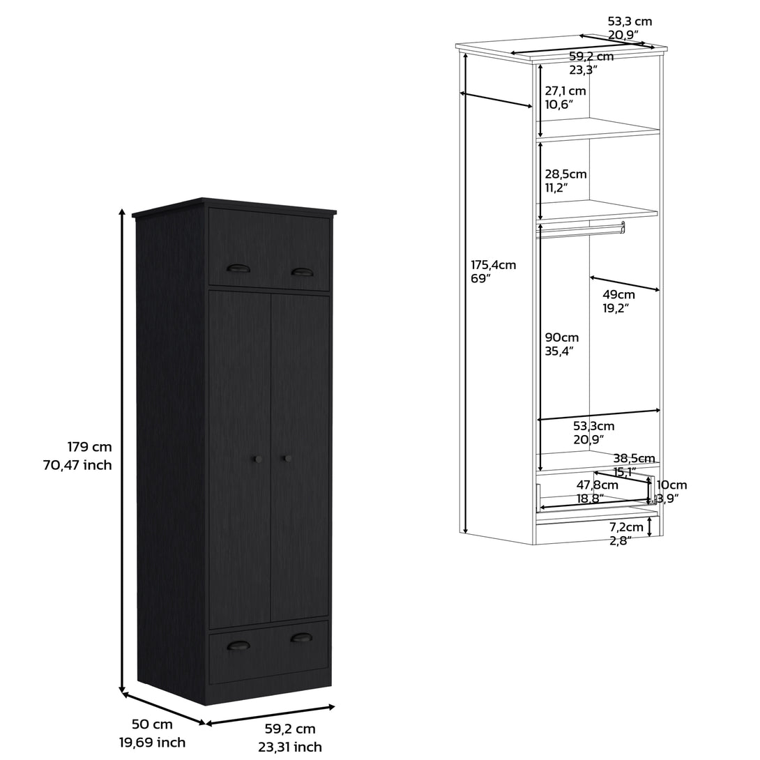 Armario falkland en melamina con 2 puertas ,2 estantes , 1 barra para colgar ropa , 1 gabinete superior y 1 cajon , negro , 179 cm X 59.2 cm X 50 cm